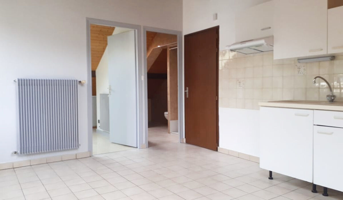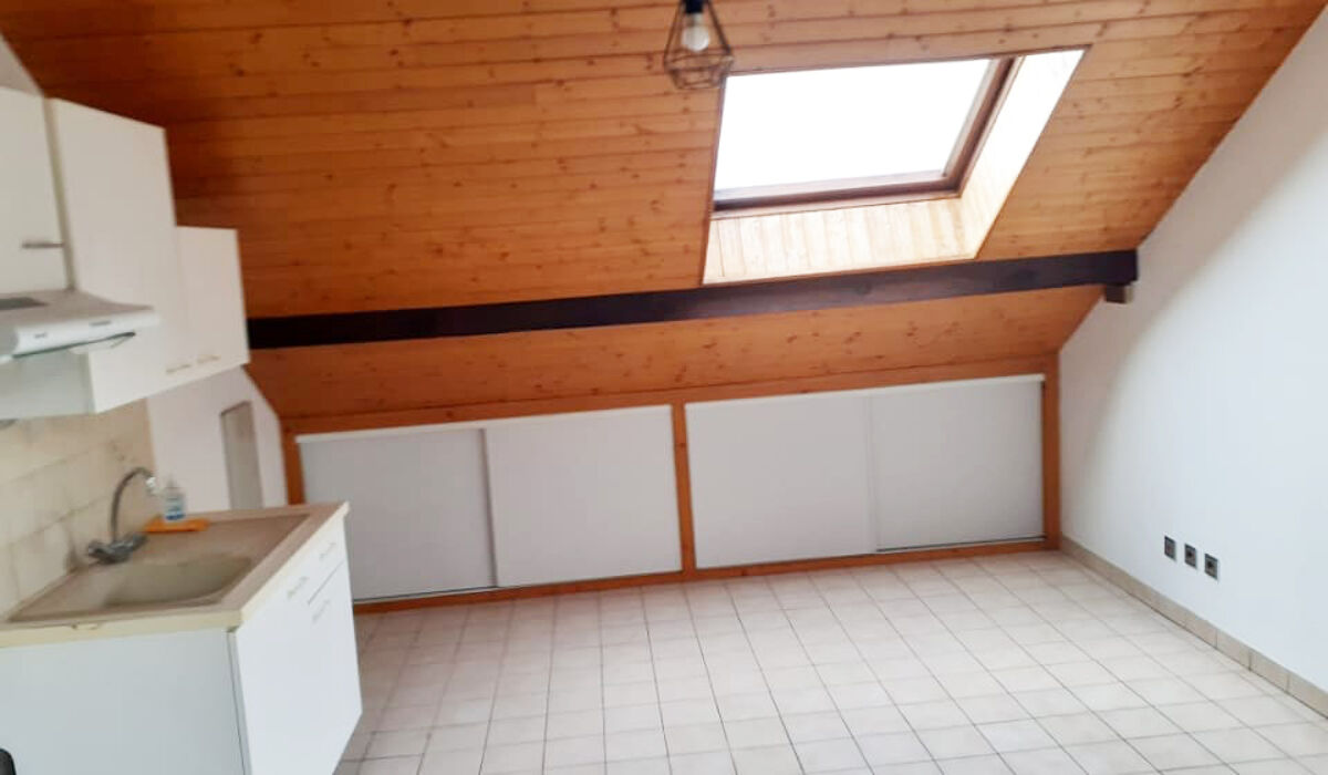 CLUSES - Quartier Calme - Petit F2 dans petite copro - 3ème étage combles - 25 M2 - une cuisine ouverte sur séjour équipée de placard de rangement - une chambre équipée de placard sous pente - une salle de bains équipée une douche, un lavabo, un WC, branchement machine à laver. Chauffage gaz individuel par chaudière murale - Une CAVE - parking privatif copro - Loyer 400 + provision sur charges 35 - Dépôt de garantie 400 - honoraires bail 240